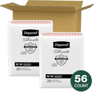 Depend Silhouette Incontinence & Postpartum Underwear for Women, Maximum Absorbency, Medium (32–42″ Waist), 56 Count (2 Packs of 28) (Packaging may vary)