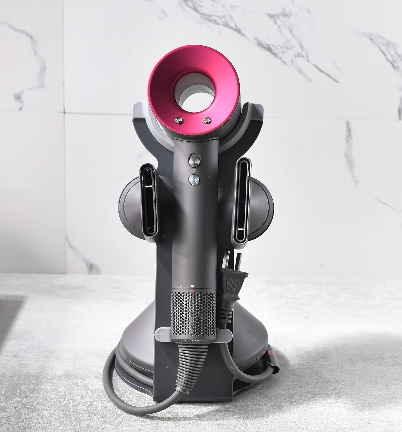 - πDESIGN FOR ORGANIZER DYSON HAIRDRYER – This hairdryer stand is perfect for your hair dryer and its accessories. The Silicone pad on the hair dryer bracket can prevent the hair dryer from being damaged. Raised iron on both sides prevents the blower from slipping.